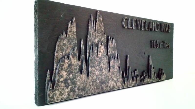 The art work is stuck onto a wood panel that can be hung from a wall. The size is 330 mm x 145 mm. The image shows an outline of the elevation of the climb and the length in metres of the Cleveland Way.